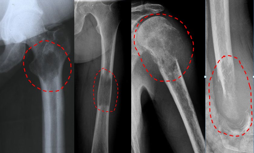 What we have described so far were lesions originating primarily from the bone or soft tissue itself. Metastases, on the other hand, are malignant cells separated from a cancerous tissue (eg lung cancer, breast cancer, kidney cancer or prostate cancer) in the body, coming to the bones through the blood and causing a mass there. Metastases are generally disorders of the middle-aged group. Here, the patient already knows that he has cancer to a large extent or is receiving cancer treatment. For example, hip, leg, shoulder, elbow or low back pain that has started recently in a patient known to have lung cancer suggests that metastasis has occurred in the foreground (image-24). Metastases are rapidly progressive malignant lesions. Treatment should be done quickly. Otherwise, severe bone pains will occur and eventually pathological fracture will be inevitable. In this case, treatment will become more difficult.