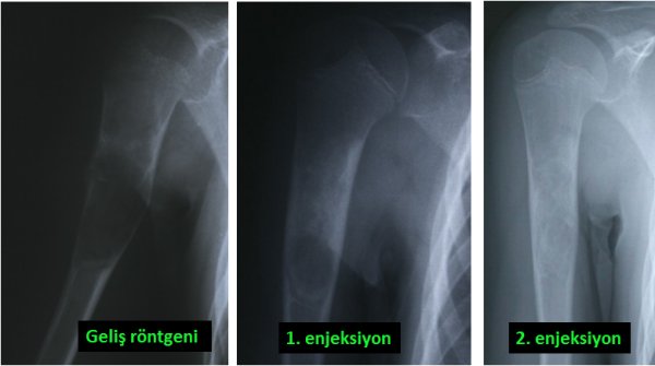 Benign bone tumors are mostly bone cysts, some tumors of cartilage origin or some lesions such as giant cell bone tumors. Cysts can be simple or complex. Simple bone cysts are more common in children. Although the most common area is around the shoulder, it can occur in any bone (picture-5). In the treatment of simple bone cyst, surgery is required in some cases, and sometimes non-surgical treatment can be applied. For this, the patient is injected into the cyst under operating room conditions and it may be necessary to repeat this several times (pic-6). What is meant by complex cyst is “aneurysmal” bone cyst. The treatment for this is only surgical, and after the cyst is cleaned, it should be treated with a number of special substances. The resulting cavity is filled with bone cement or bone powders (pic-7). Aneurysmal bone cyst is a more aggressive lesion than simple bone cyst and sometimes it can completely remove the bone. There is also a higher chance of recurrence.
