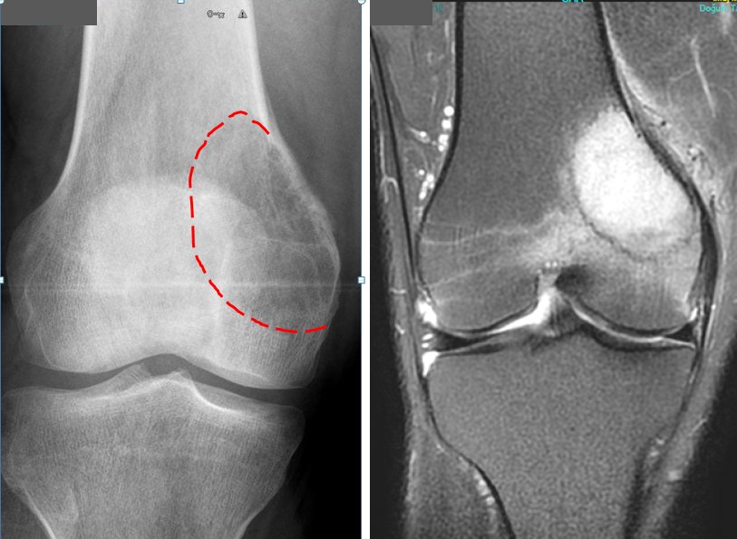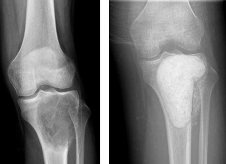 The symptoms of bone tumors are blunt pains, which are often at night, sometimes even very severe. In other words, a person whose knee or hip has been hurting for several months may have a bone tumor. Benign bone tumors often do not extend beyond the bone. Malignant ones, on the other hand, often exceed and extend to the soft tissue around the bone. In these patients, swelling will occur, as in soft tissue tumors (pic-34). In addition, the bone is very weakened in this region. If the patient continues to load, a fracture of the bone may also occur. This is a pathological fracture and makes treatment much more difficult. Sometimes it can even cause amputation.