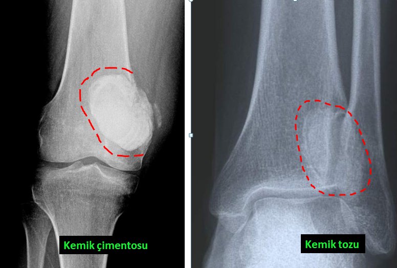 Giant cell bone tumor is also more common in young people. Although this type of tumor is mostly seen in the knee, it occurs in all parts of the body, especially in the joint areas (picture-10). It is usually in the form of blunt pain felt in the last few months. It can only be treated with surgery. The tumor is completely removed from the bone and the cavity is filled with bone cement or bone powders (pic-11). If the removal of the tumor is not done completely, recurrence is inevitable.